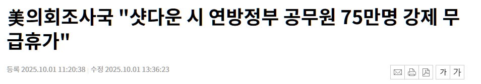 미국 셧다운으로 공무원 75만명 일시 휴직